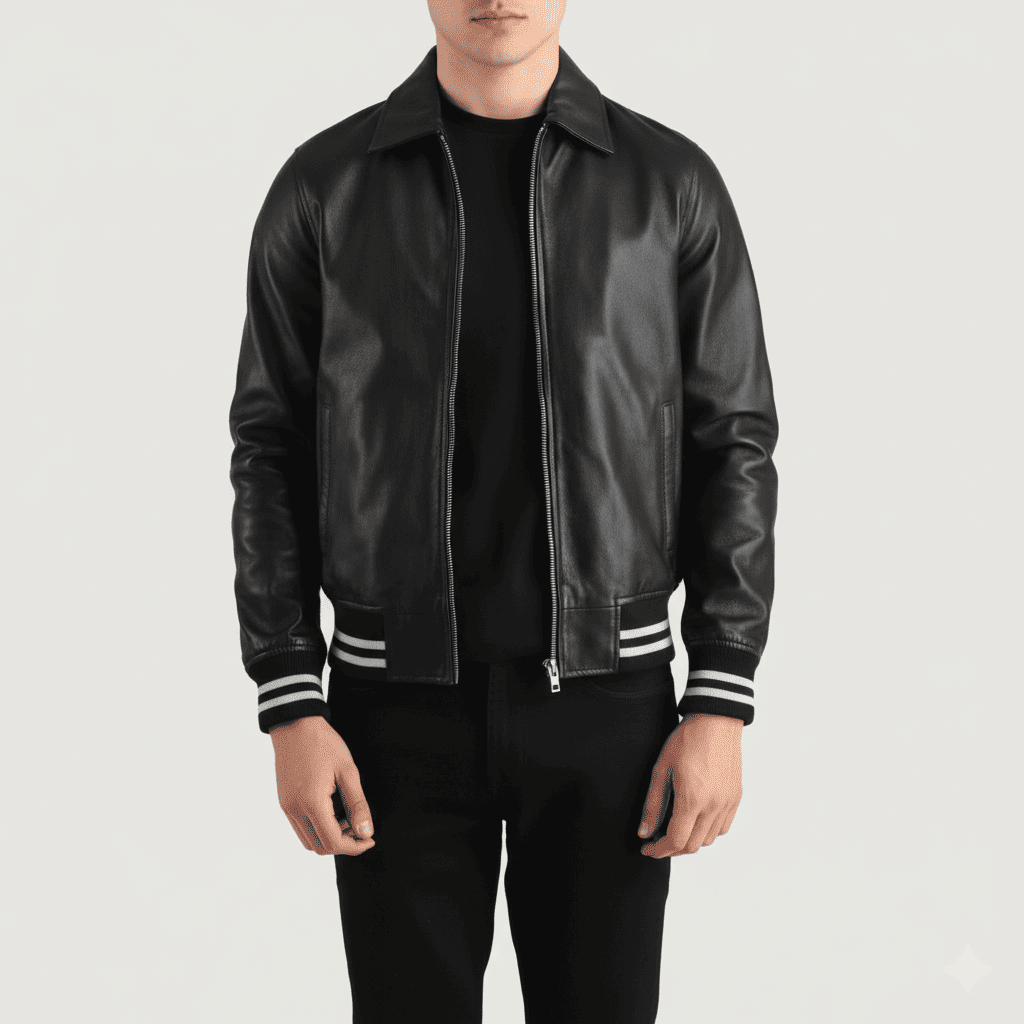 A classic varsity bomber jacket featuring a deep green body and tan leather (or faux leather) sleeves. Includes striped ribbed trim on the collar, cuffs, and hem, and a snap-button front closure. Perfect for timeless style and warmth.